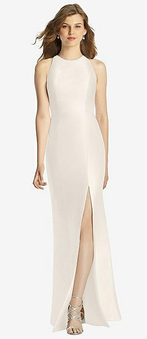 Shirred Skirt Jewel Neck Halter Dress with Front Slit in ivory