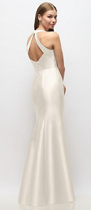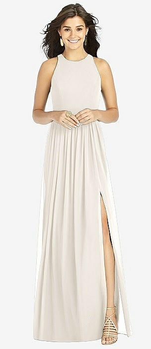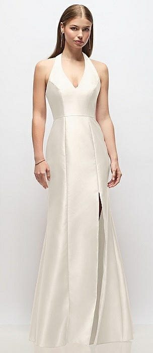 Shirred Skirt Jewel Neck Halter Dress with Front Slit in ivory