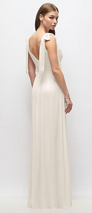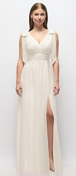 Plunge Neckline Bow Shoulder Empire Waist Chiffon Maxi Dress in ivory