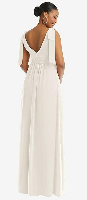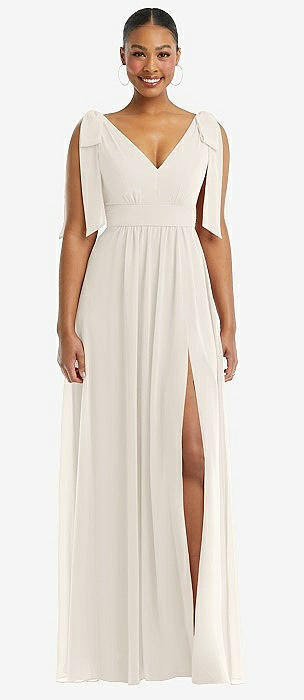 Plunge Neckline Bow Shoulder Empire Waist Chiffon Maxi Dress in ivory