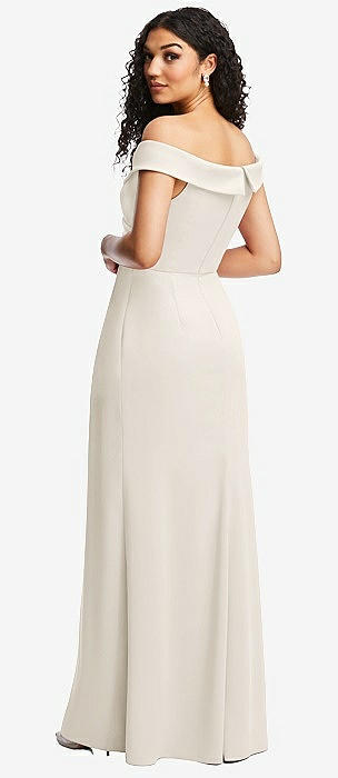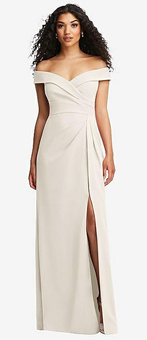 Cuffed Off-the-Shoulder Pleated Faux Wrap Maxi Dress in ivory