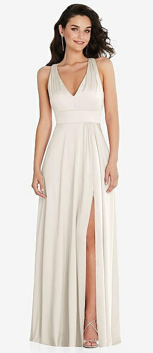 Shirred Shoulder Criss Cross Back Maxi Dress with Front Slit in ivory