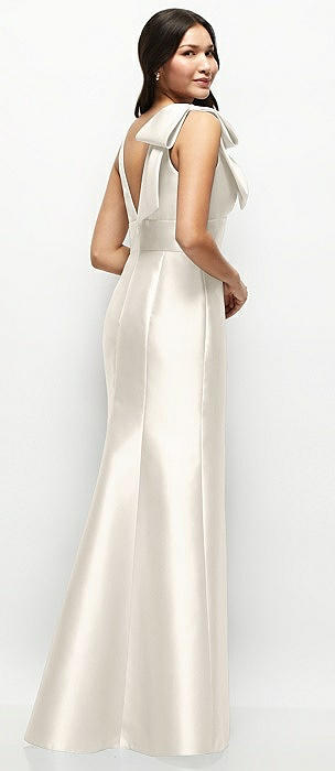 Deep V-back Satin Trumpet Dress with Cascading Bow at One Shoulder in ivory