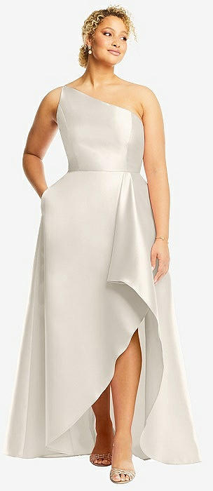 One-Shoulder Satin Gown with Draped Front Slit and Pockets in ivory