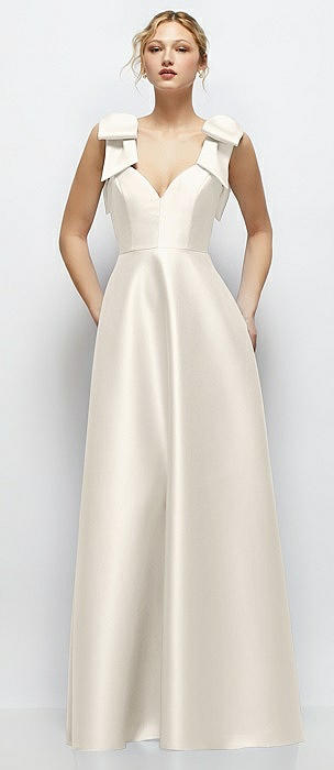 Deep V-Neck Satin Ball Gown with Shoulder Bows in ivory
