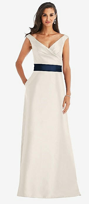 Off-the-Shoulder Draped Wrap Satin Maxi Dress in ivory