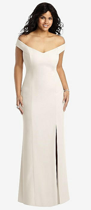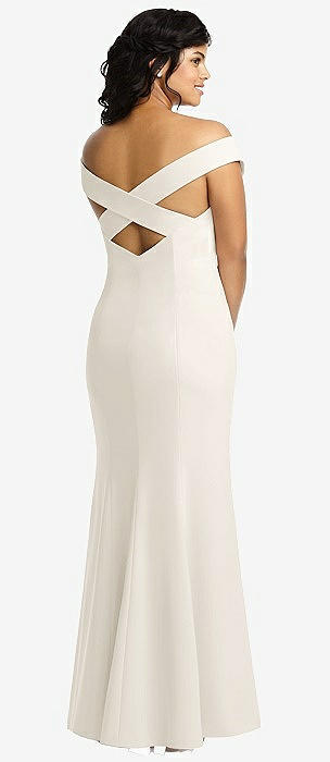 Off-the-Shoulder Criss Cross Back Trumpet Gown in ivory
