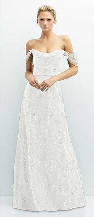 Off-the-Shoulder A-line 3D Floral Embroidered Dress in ivory