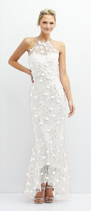 Sheer Halter Neck 3D Floral Embroidered Dress with High-Low Hem in ivory