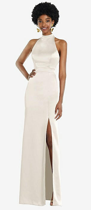 High Neck Backless Maxi Dress with Slim Belt in ivory