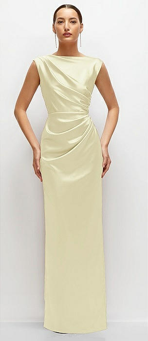 Sleeveless Draped Wrap Bodice Stretch Satin Column Maxi Dress in butter yellow