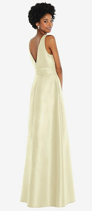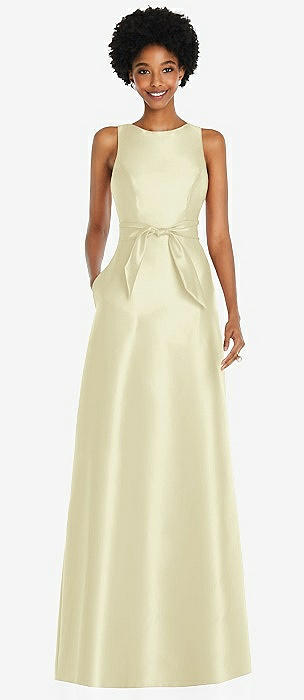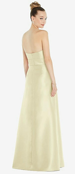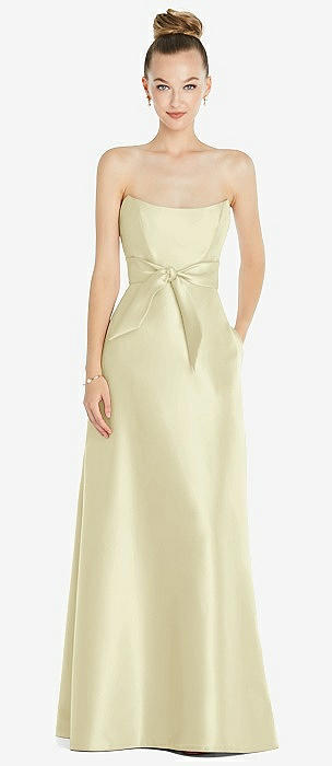 Basque-Neck Strapless Satin Gown with Mini Sash in butter yellow