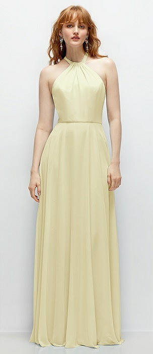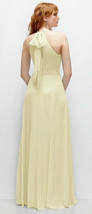 Shirred Halter Chiffon Maxi Dress with Back Sash-Tie Closure in butter yellow
