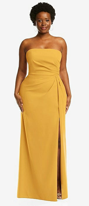 Strapless Pleated Faux Wrap Trumpet Gown with Front Slit in NYC yellow