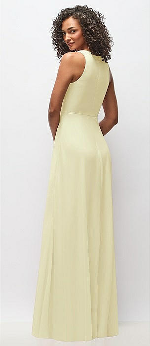 Shirred Skirt Jewel Neck Halter Dress with Front Slit in butter yellow