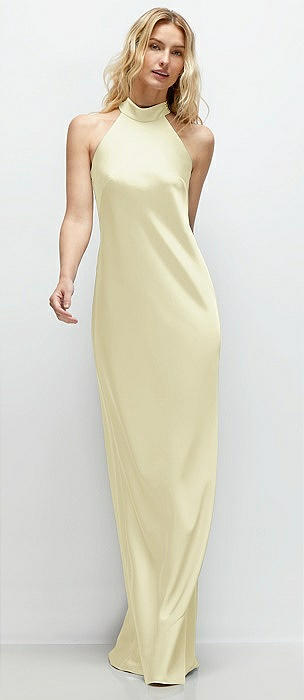 High-Neck Halter Open-Back Satin Trumpet Dress in butter yellow