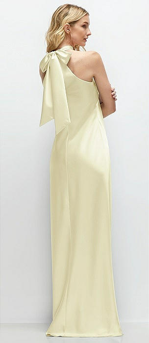 Stand Collar Bias Satin Maxi Dress with Self-Tie Bow Back in butter yellow
