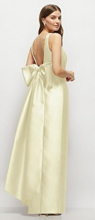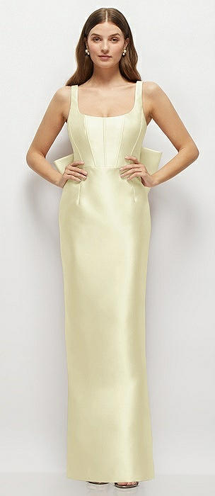 Scoop Neck Satin Column Maxi Dress with Bow at Empire Waist in butter yellow