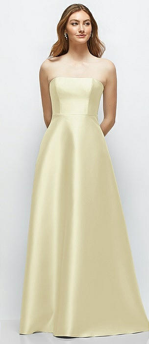 Strapless Notch Satin Gown with Pockets in butter yellow