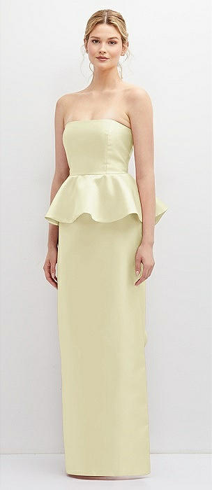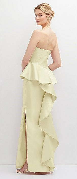 Strapless Satin Maxi Dress with Cascade Ruffle Peplum Detail in butter yellow