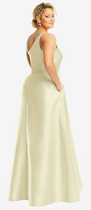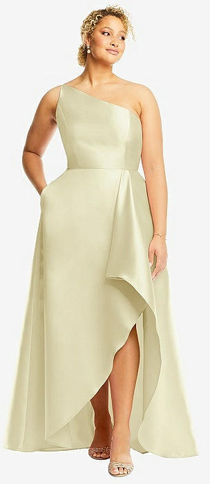One-Shoulder Satin Gown with Draped Front Slit and Pockets in butter yellow