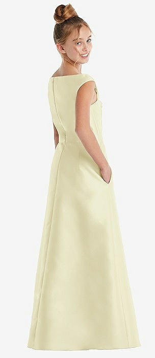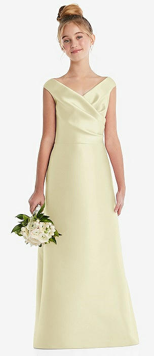 Off-the-Shoulder Draped Wrap Satin Junior Bridesmaid Dress in butter yellow