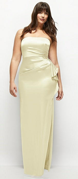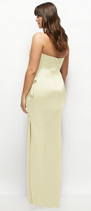 Strapless Draped Skirt Satin Maxi Dress with Cascade Ruffle in butter yellow