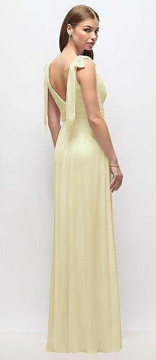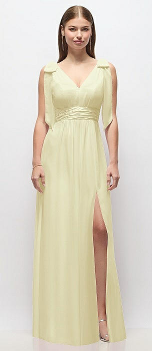 Plunge Neckline Bow Shoulder Empire Waist Chiffon Maxi Dress in butter yellow