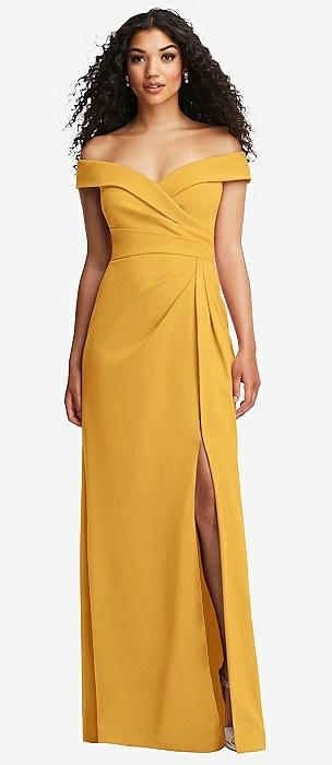 Cuffed Off-the-Shoulder Pleated Faux Wrap Maxi Dress in NYC yellow