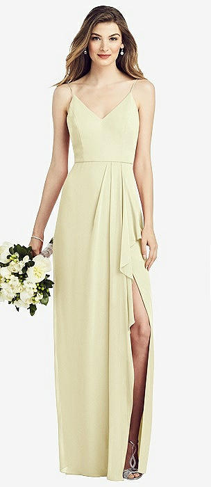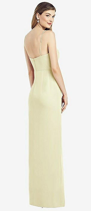 Spaghetti Strap Draped Skirt Gown with Front Slit in butter yellow