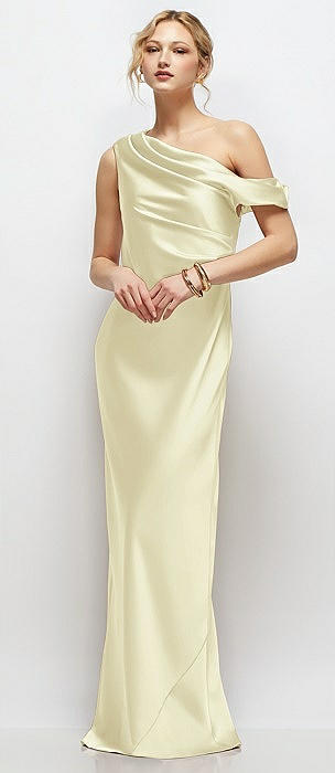 One-Shoulder Draped Bodice Stretch Satin Column Maxi Dress in butter yellow