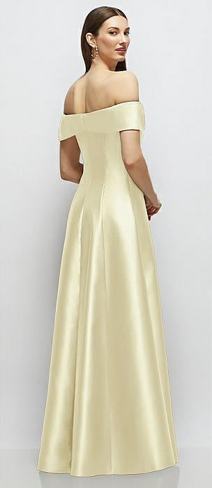 Off-the-Shoulder Bow-Back Satin Trumpet Gown in butter yellow
