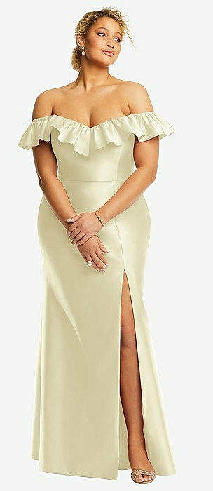 Off-the-Shoulder Ruffle Neck Satin Trumpet Gown in butter yellow
