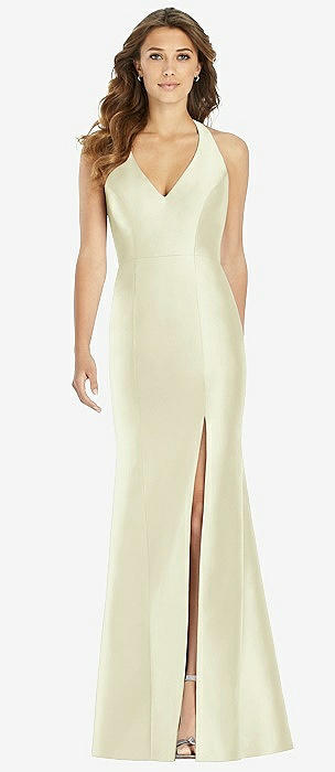 V-Neck Halter Satin Trumpet Gown in butter yellow