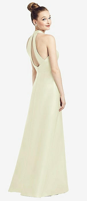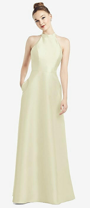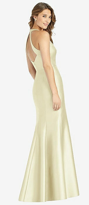 High-Neck Halter Open-Back Satin Trumpet Dress in butter yellow