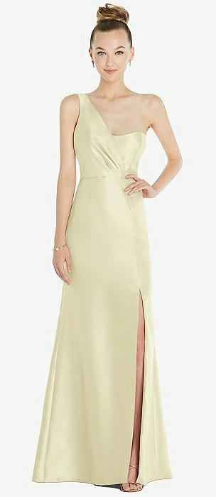 Draped One-Shoulder Satin Trumpet Gown with Front Slit in butter yellow