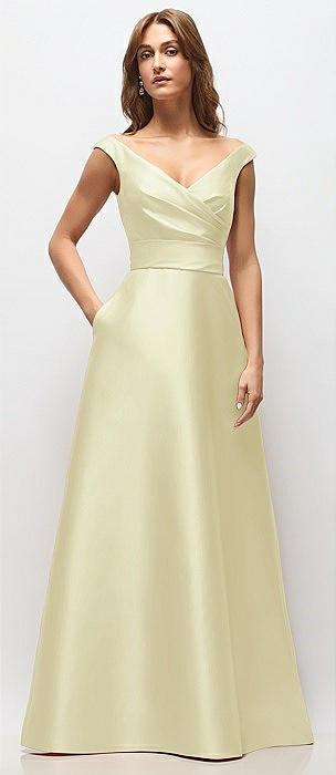 Off-the-Shoulder Draped Wrap Satin Maxi Dress in butter yellow