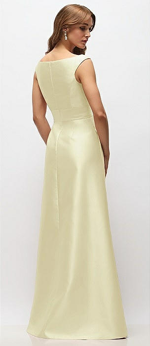 Basque-Neck Satin Column Maxi Dress with Off-the-Shoulder Bows in butter yellow