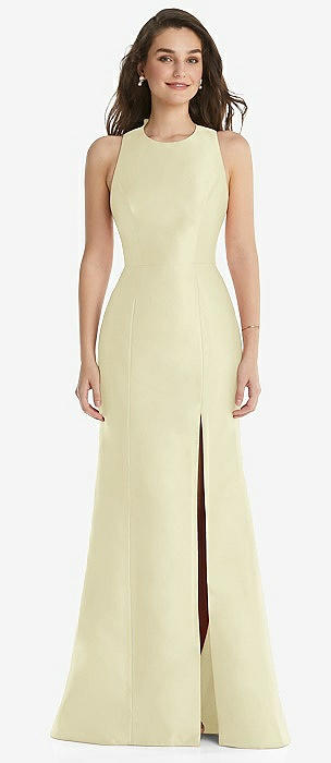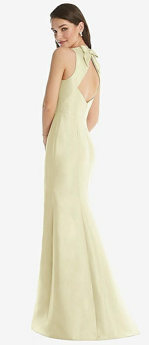 Jewel Neck Bowed Open-Back Trumpet Dress with Front Slit in butter yellow