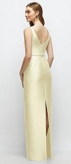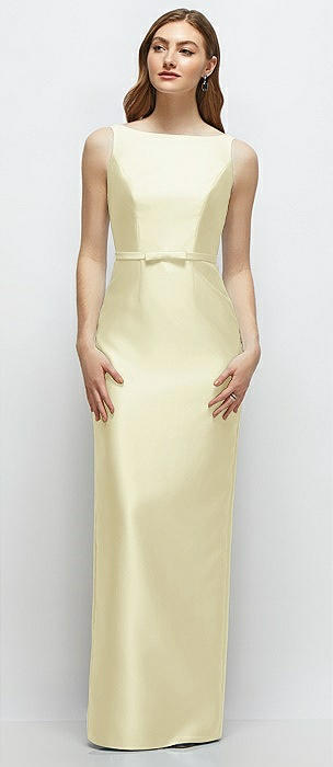 Bateau Neck Satin Column Dress with Bow-Trimmed Skinny Belt in butter yellow