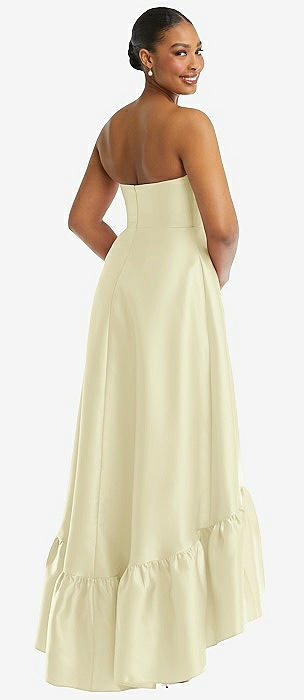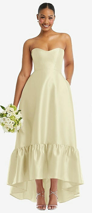 Strapless Deep Ruffle Hem Satin High Low Dress with Pockets in butter yellow