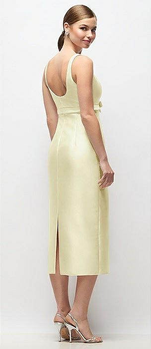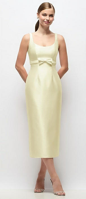 Scoop Neck Satin Column Midi Dress with Bow at Empire Waist in butter yellow
