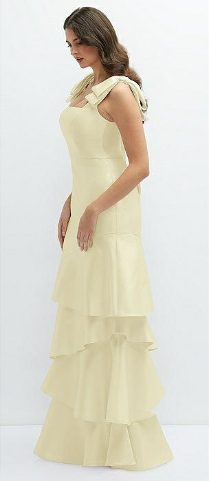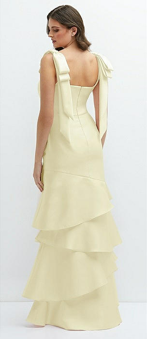 Bow-Shoulder Satin Maxi Dress with Asymmetrical Tiered Skirt in butter yellow