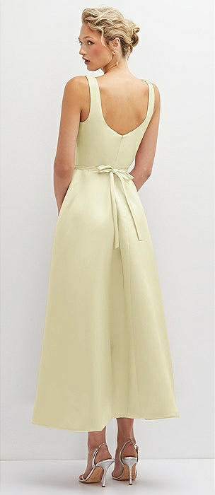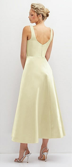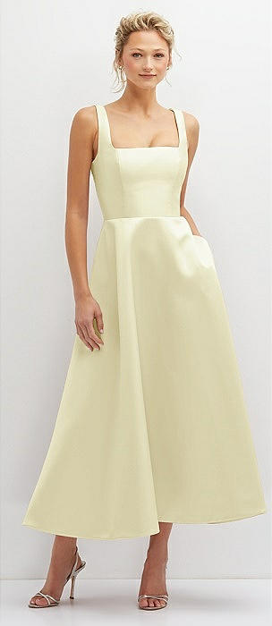 Square Neck Satin Midi Dress with Full Skirt & Pockets in butter yellow