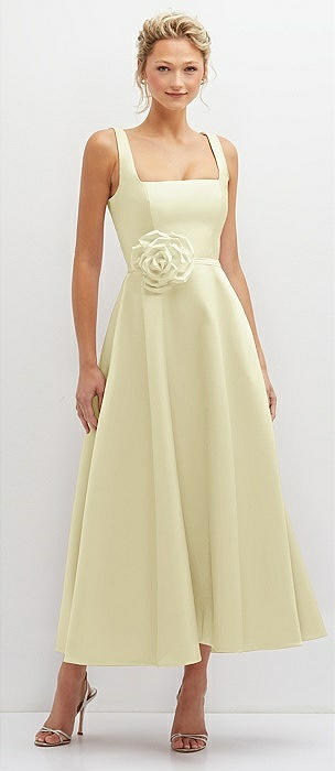 Square Neck Satin Midi Dress with Full Skirt & Flower Sash in butter yellow