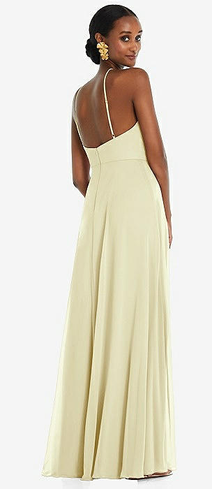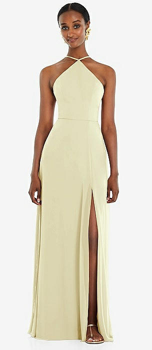 High Halter Tie-Strap Open-Back Satin Maxi Dress in butter yellow