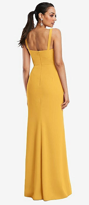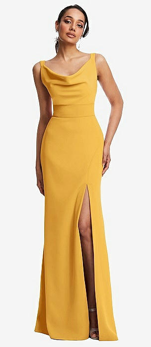 Cowl-Neck Wide Strap Crepe Trumpet Gown with Front Slit in NYC yellow