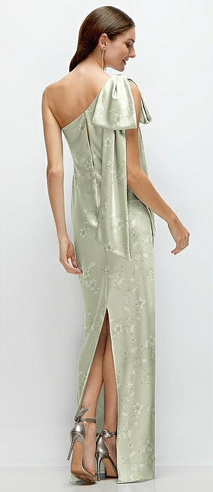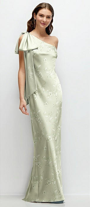 One-Shoulder Bias-Cut Floral Satin Maxi Dress with Cascading Shoulder Bow in vintage primrose celadon