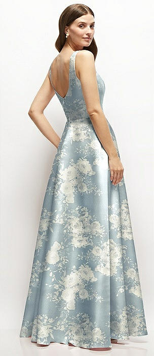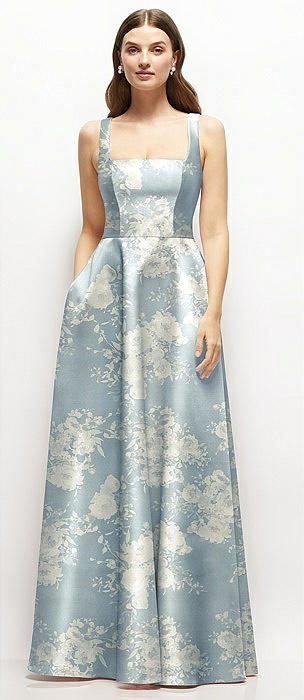Floral Square-Neck Satin Maxi Dress with Full Skirt in porcelain blue seraphina floral