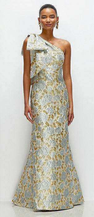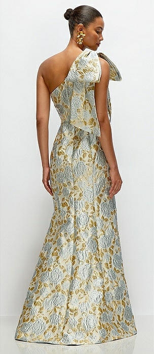 Bow One-Shoulder Gold Leaf Brocade Maxi Dress with Trumpet Skirt in winter mist